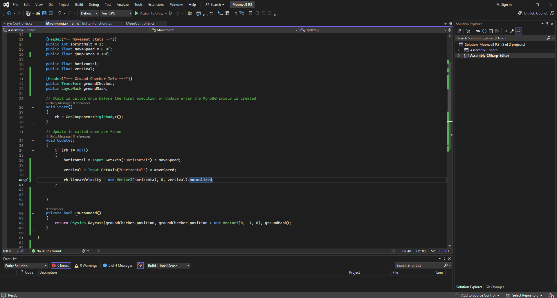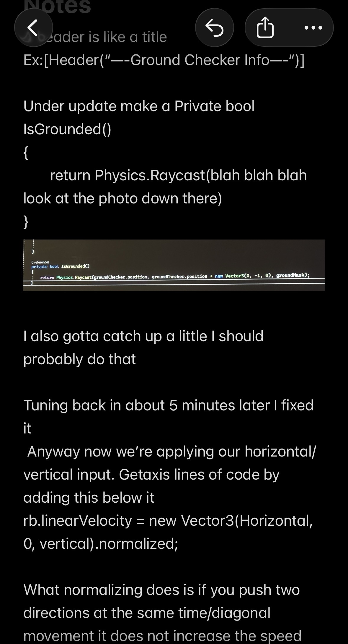 I learned what and how to use a header properly. It essentially is a title for example: [Header("---Ground Checker Info---")]. I also learned what normalized is, basically what it does is if you push two directions at the same time/diagonal movement it does not increase the speed. Line 40 essentially saying move the rigid body in this direction at a constant speed. The return line is checking "Is there ground directly underneath my character.